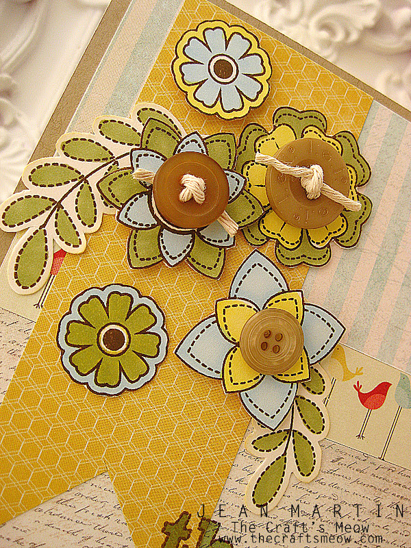 I randomly placed the flowers on the banner I made and put some of them in different heights using foam tape. These flowers are just so cute. I imagine I'll be using them a lot. I added some buttons to tie them all in.